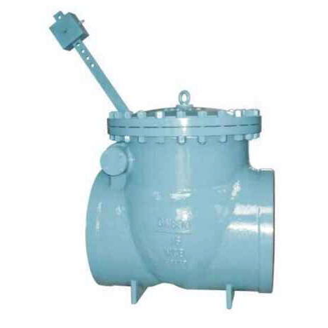 2、重錘通過(guò)加長(zhǎng)桿和撥叉作用于銷(xiāo)軸,用以平衡和搖桿的重力矩,防止水錘現(xiàn)象的發(fā)生。當(dāng)介質(zhì)正向流動(dòng)時(shí),有助于打開(kāi)閥門(mén),并在運(yùn)行中保持閥門(mén)的平穩(wěn)和減少振動(dòng)。